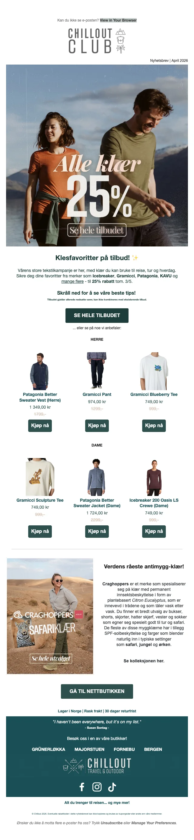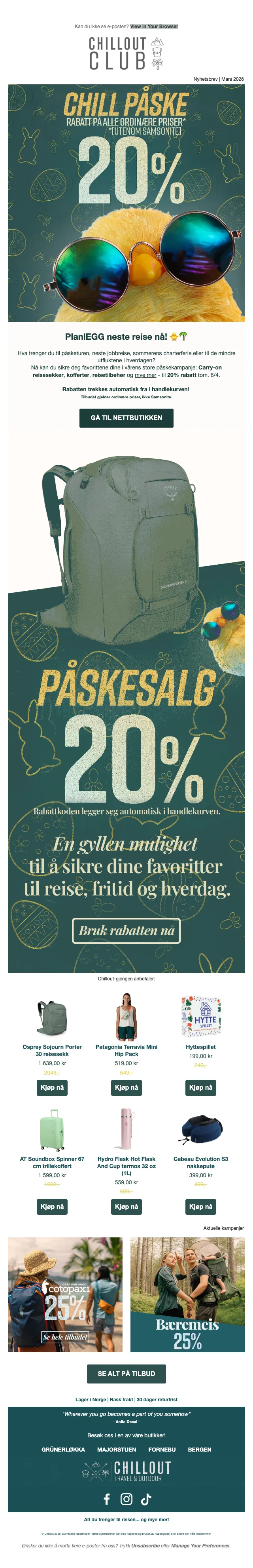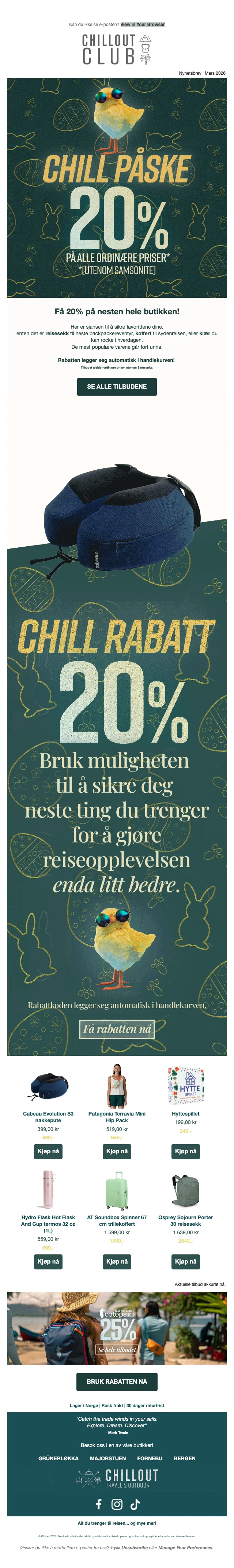 Gjør deg klar for tur med 10% rabatt på turutstyr hos Chillout. Alt fra telt og soveposer til campingkjøkken, klar for ditt neste utendørseventyr.