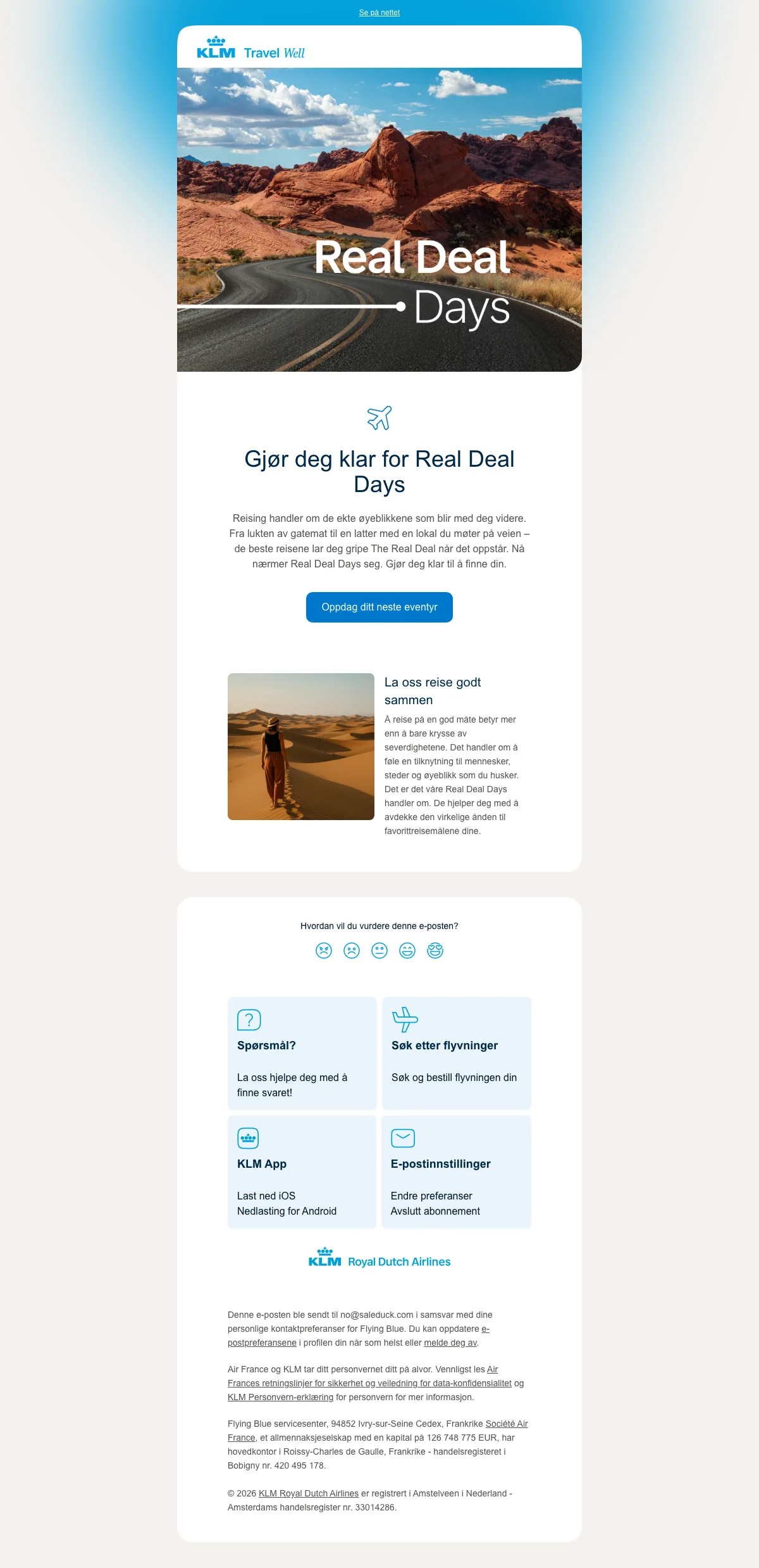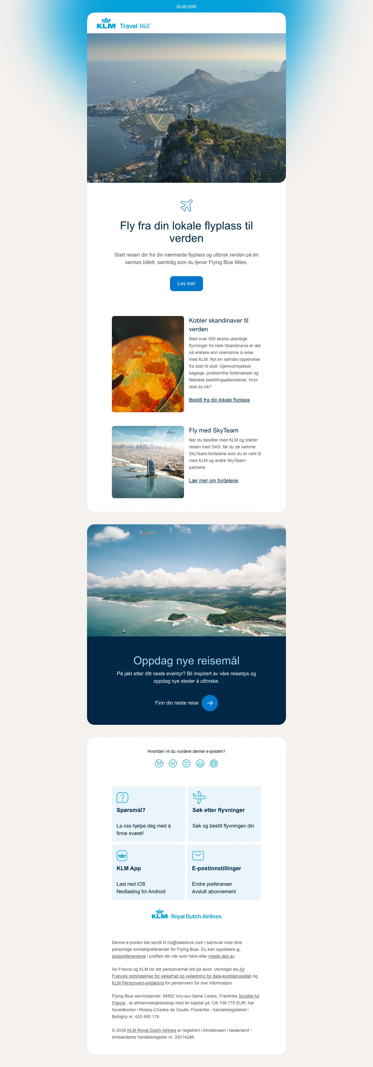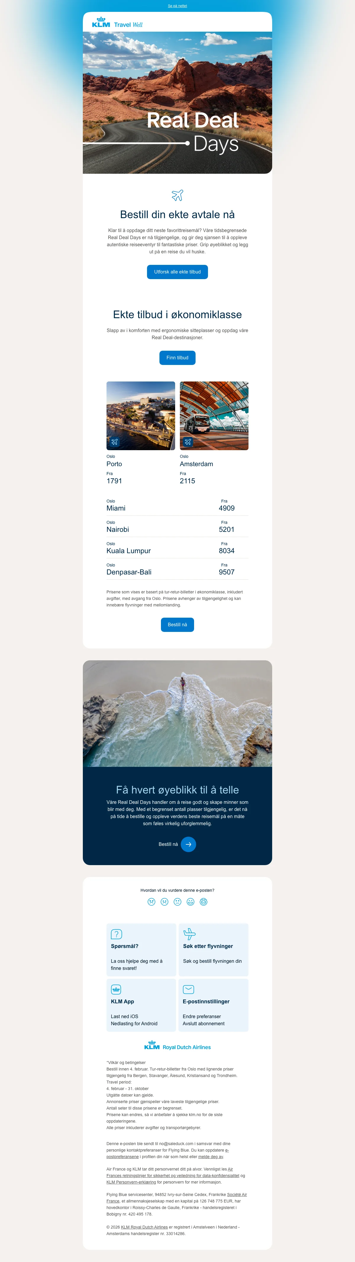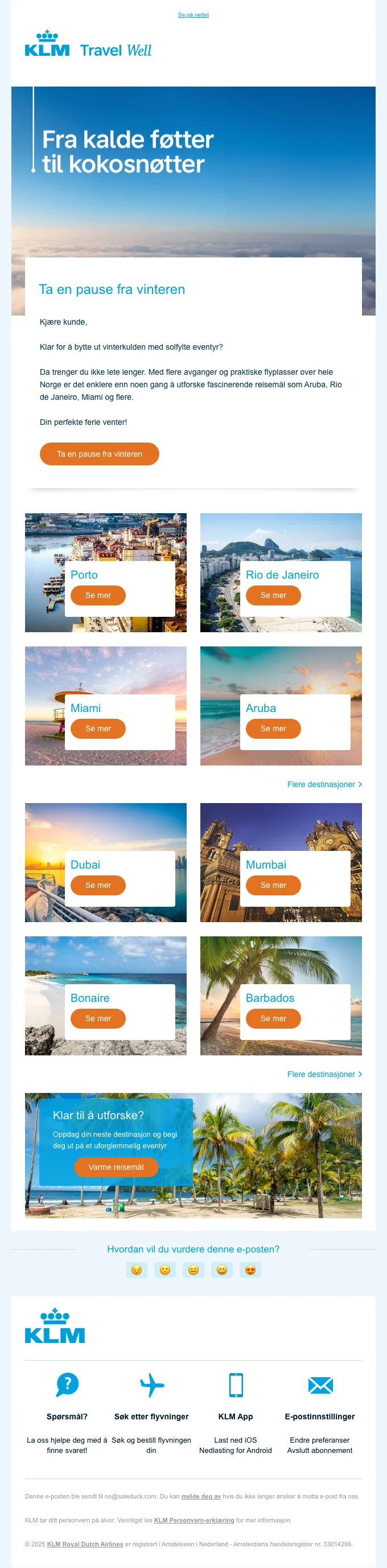 KLM flyr deg til de fleste steder i verden og har 177 steder de flyr til hver dag. Noen av disse poulære stedene er Spania, Tyskland, Nederland, Norge, Sverige, USA, Dubai, Bergen, Oslo, Ålesund, Kristiansand, Sandefjord Torp, Stavanger, Trondheim. Amsterdam og mange flere destinasjoner.