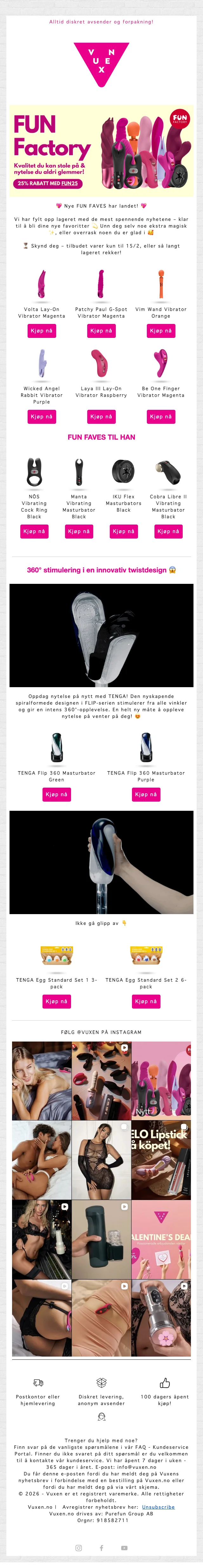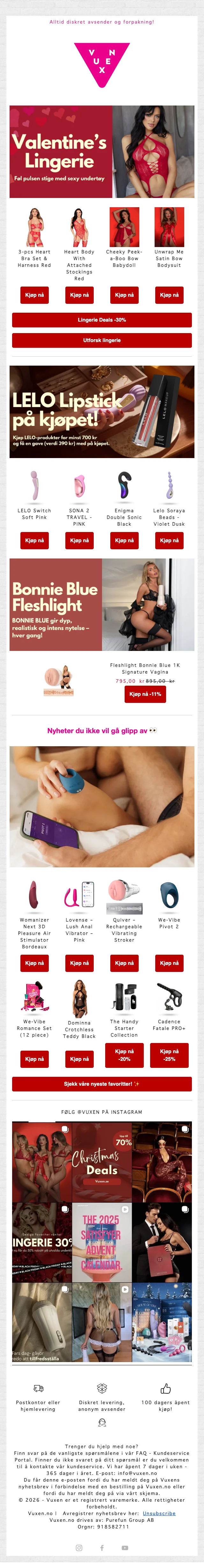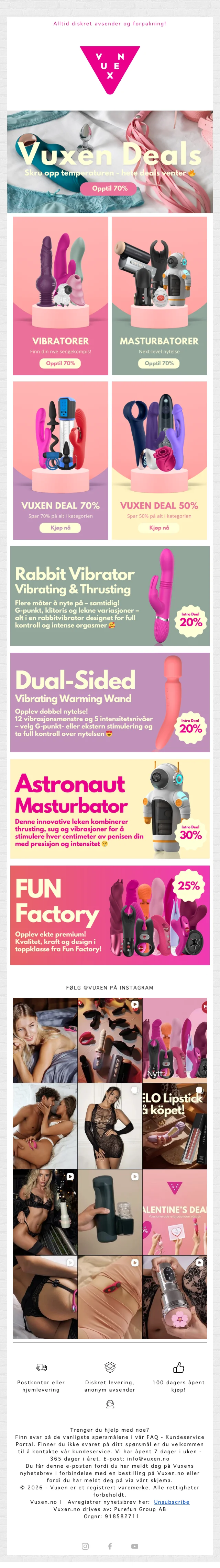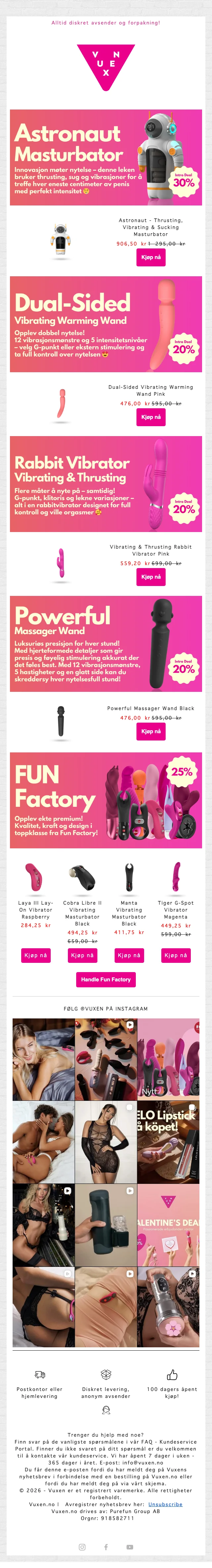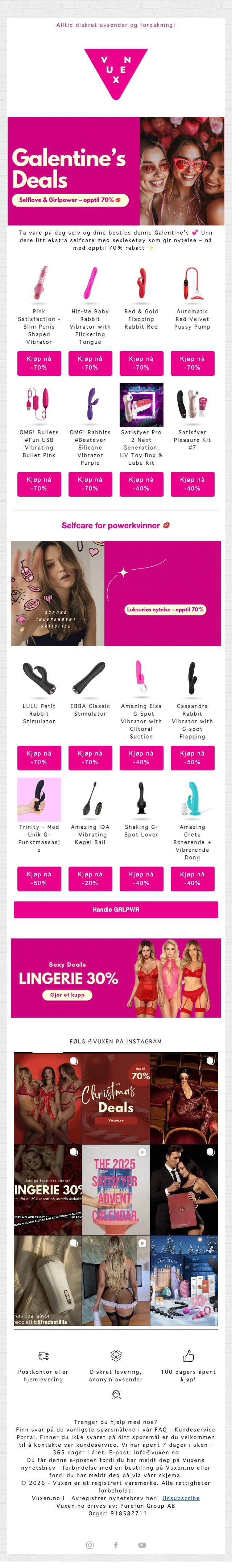 Spar opptil 70% på utvalgte kundefavoritter med betydelige prisavslag på et bredt sortiment. Diskret levering og anonym avsender sørger for privat mottak, og 100 dagers åpent kjøp gir ekstra trygghet ved kjøpet.